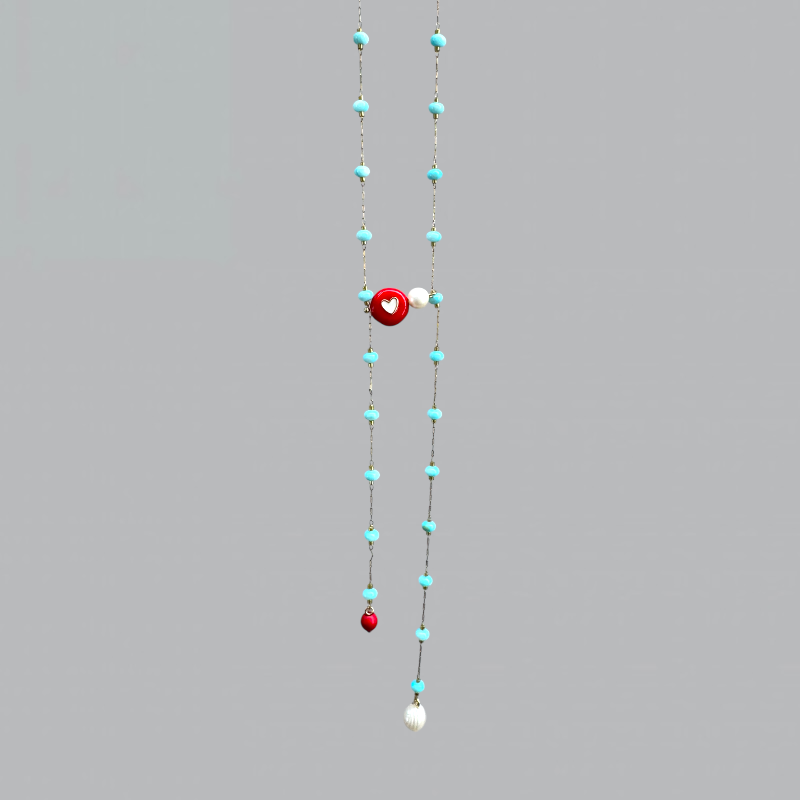 material: stainless steel necklace , shell beads, brass metal motif heart-enamel, fresh water pearls, haolite bead.