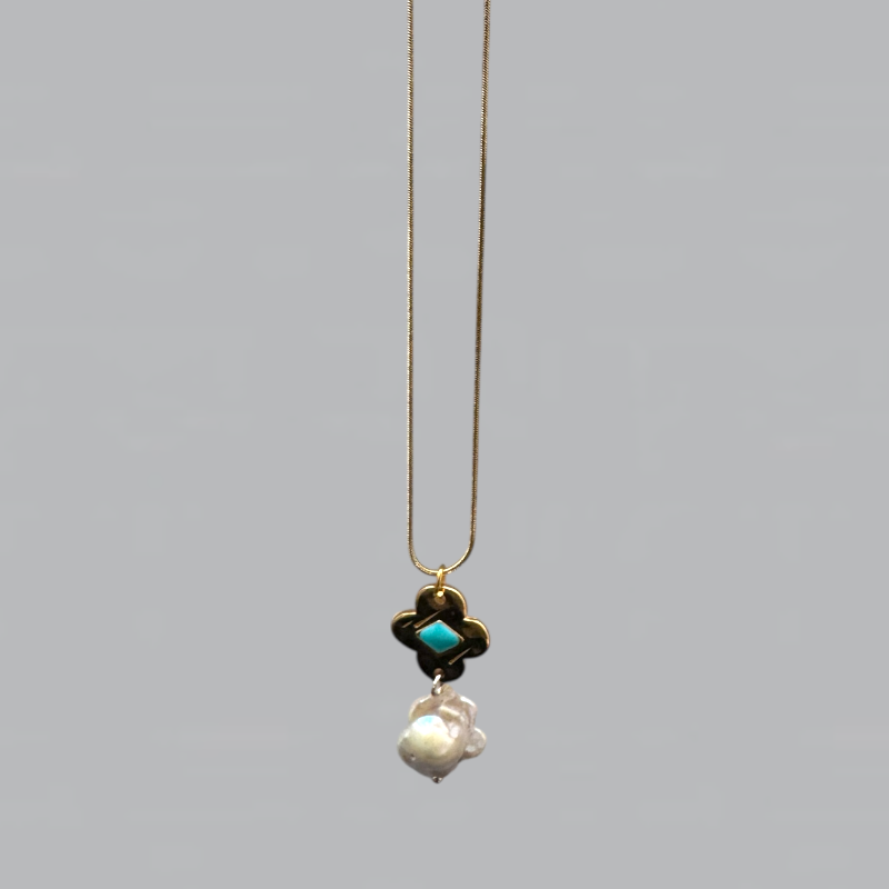 material: gold plated stainless steel snake chain, fresh water pearl flower motif ,brass metal vitraux motif with 24K gold plating.
