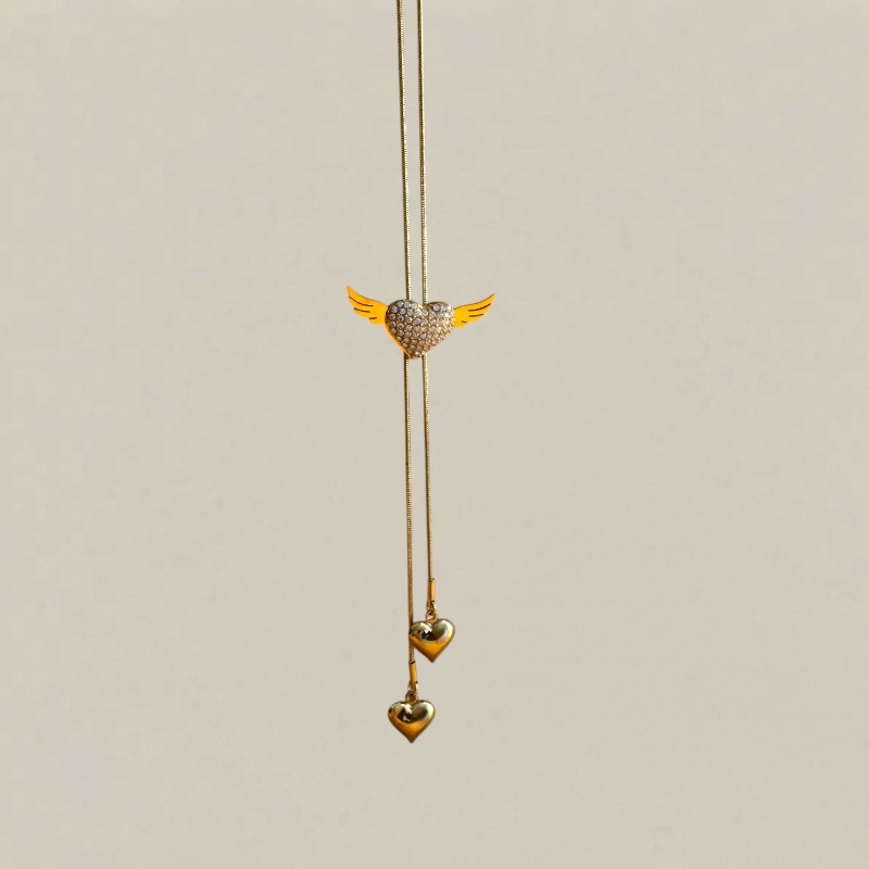 υλικό: ατσάλινο επιχρυσωμένο κολιέ ,μοτιφ καρδιά φτερό λευκά ζιργκον.