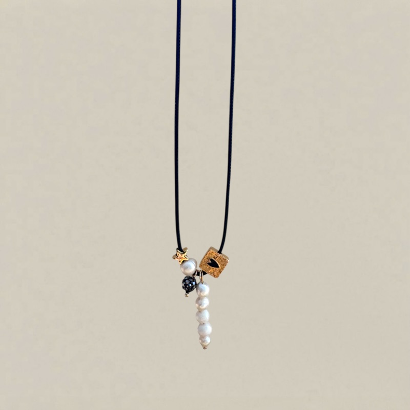 υλικό: μαύρο δερμάτινο κορδόνι, μαργαριτάρια του γλυκού νερού , ορειχάλκινα μοτιφ με επιχρύσωση 24Κ.